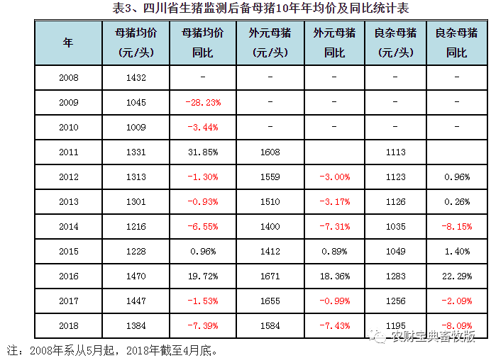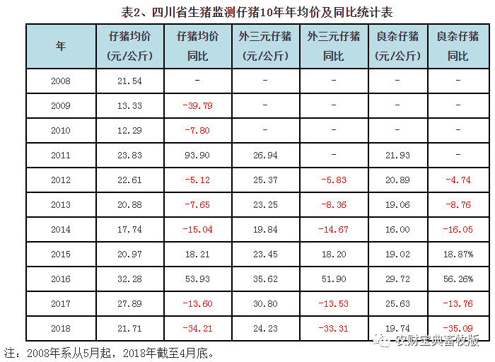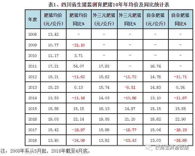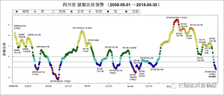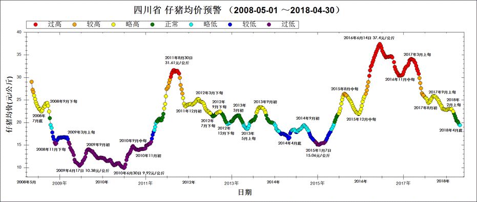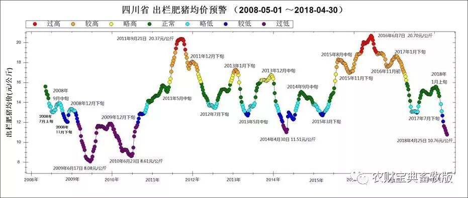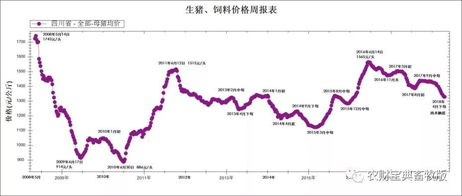 四川省生猪生产及价格监测,自2008年5月正式启动至2018年4月底已整整10年。10年来,监测分析平台累计形成统计、分析并衍生了1个省级、18个市级和68个县级有关生猪生产及价格监测6大类、20项、11子项、160个指标的147.44万个数字;截至4月底,共计发布价格周报510余期、生产及价格月(季)报150余期、半年和全年生产及价格形势分析报告20余份;在价格剧烈波动年份被政府有关部门采信各类资料超过50余份;接受中央和地方电视报刊网站主流媒体采访及转载各类资料300余次。监测系统已成为四川省生猪生产及价格分析的重要基础,为建立四川省生猪大数据系统探索了有益的路径。以下就四川省监测点10年来(2008年5月~2018年4月)按年度价格和生产数据的一些特征作简要提示,并将结论交由读者研判。 一、生猪价格10年走势基本特征 从表1中看出,2007年全国性生猪价格大涨之后,2008年调头下行,2009年全年处于低谷亏损阶段,至2010年6月才触底回升;2011年全年大涨,同比涨幅为10年之冠,此后振荡下行在成本线附近上下起伏两年;2014年再次破位下行,年均价好于2009年但再次亏损;2014年4月底触底后反转向上,重复2011~2013年的“故事”,直至2018年1月又再次向下至深亏区。 从图1看出,10年中,共计出现较大以上拐点25次,其中向上拐点12次、向下拐点13次;最高峰值两次,分别出现在2011年9月中旬和2016年6月上旬;最低谷底4次,分别出现在2009年6月中旬、2011年6月下旬、2014年4月末和2018年4月下旬(尚未触底)。 ☆ 4大基本趋势 ☆ 综上得出4个基本趋势:一是“猪周期”不复存在。2008年6月破位至2010年6月触底,亏损期长达两年之久。之后大约每3年进入一次年度深度亏损(2009~2010年、2014年、2018年),过去行业定义的猪周期“一年赢、一年平、一年亏”已不复存,被当年或跨年度大幅波动所取代。 二是峰谷价格时期相对集中。10年中,向下拐点多出现在每年的1月(3次)、9月(3次)和12月(4次),偶有6、8月份;向上拐点(触底)多集中出现在每年的5月(2次)、6月(2次)、7月(3次)和11月(3次),3、4月各1次,即:5~7月触底和11月再次回升的几率较多。 三是下穿均衡线频率高。10年中,下穿猪粮(料)比均衡线达7次,低于猪粮比4比1(猪料比3比1)深亏区1次,但盈利超高区猪料比次数多于猪粮比;2009年育肥猪年均价最低、亏损最大,2016年年均价最高、盈利最大。 四是品种间市场价差不大。从2011年将外三元和良杂肥猪价格分开统计填报后,7年来,外三元肥猪年均价较良杂肥猪年均价高0.80元/公斤~1.20元/公斤之间,最大幅度不到8%。 图1、四川省生猪监测育肥猪10年均价走势图 注:2008年系从5月起,2018年截至4月底。 从表2看出,仔猪10年间的年度均价与育肥猪的年度均价趋势接近,但领涨领跌风向标趋势明显。一是2009年仔猪年均价同比跌幅深于育肥猪近19个百分点,2010年育肥猪年均价同比上涨而仔猪却继续下跌7.80%;二是2011年生猪价格全面回升时,仔猪年均价同比涨幅近94%、远高出育肥猪涨幅近40个百分点,为10年间涨幅之冠;三是在2016年又一个全面上涨之年里,仔猪年均价达到10年间的顶峰32.28元/公斤,较最低年2010年年均价上涨近163%,同时,涨幅同比虽然低于2011年,但却高出育肥猪年均价同比涨幅32个百分点。 从图2来看,10年中,仔猪均价共计出现较大以上拐点30次,其中向上和向下的拐点各15次,均多于育肥猪拐点次数;从年度来看,均价过高3次,分别出现在2011年8月末、2016年6月14日的37.40元/公斤和2017年3月上旬,2016年全年处于价格高位区域;均价过低均价3次,分别出现在2010年6月30日的十年最低价9.92元/公斤、2009年6月中旬和2015年1月上旬,2009年~2010年连续两年仔猪价格处于低迷期;最高均价与最低均价价差达27.48元/公斤;从外三元与良杂仔猪市场价差来看,差价在4元/公斤以上。 图2、四川省生猪监测仔猪10年均价走势图 从表3看出,10年间,后备母猪年均价跌多涨少(7跌3涨),涨跌幅度均小于育肥猪和仔猪;跌幅最深为2009年的-28.23%,涨幅最高为2011年的31.85%;年度均价最高为2016年的1470元/头、最低为2010年度的1009元/头,价差幅度45.69%,年度均价下穿1200元/头有两次,其中2009年年度均价也险破千元大关。 从图3看出,10年间,出现较大拐点20次,其中向上和向下的拐点分别为9次和11次,次数均低于育肥猪和仔猪;最高均价为2008年5月14日的1743元/头,次高均价分别为2016年6月14日的1565元和2011年6月12日的1515元/头,最低均价为2010年6月30日的886元/头,次低均价为2009年6月17日的914元/头,最高与最低均价价差达857元/头、幅度达49.17%,10年间两次破位1000元/头分别出现在2009年6月中旬和2010年6月底。 图3、四川省生猪监测后备母猪10年均价走势图 注:2008年系从5月起,2018年截至4月底。 从表4中看出,年度市场猪肉零售均价和肉—猪价差同比均呈同涨同跌、5涨5跌,但肉—猪价差跌幅始终小于猪肉零售价,说明中间环节在生猪价格下降通道中保持了其盈利稳赚不亏的态势;猪肉零售年均价同比涨幅最高年份为2011年的40.77%,跌幅最大年份为2009年的-17.97%;最高年均价为2016年的29.50元/公斤,最低年均价为2009年的18.35元/公斤,价差为11.15元/公斤。 从图4、图5来看,猪肉10年市场零售均价较大以上拐点26次,向下和向上拐点各13次,最低均价出现在2009年6月24日的14.26元/公斤、最高均价出现在2011年9月21日的31.45元/公斤,最高与最低价差达17.19元/公斤,次高均价出现在2016年6月7日的31.06元/公斤,与10