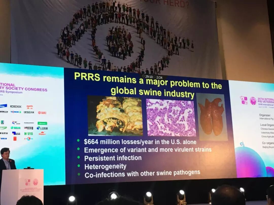 Meng 教授首先从蓝耳防控的必要性和难度上谈起。众所周知,蓝耳已经给养猪产业造成了巨大损失,仅美国每年造成的损失就达到6.64亿美元。而蓝耳难以防控也是与其易变性相关,表现为变异速度快,并造成猪群持续感染,不同毒株间交叉保护差,并由于其对免疫系统的损伤可造成共感染和继发感染等问题。