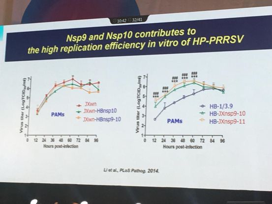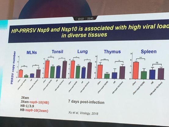 最终韩军博士通过相关学者的数据揭示了HP-PRRSV的毒力决定基因,通过感染性克隆进行病毒拯救,将NSP9和NSP10在高致病性蓝耳毒株和经典毒株之间进行基因互换,发现NSP9和NSP10与病毒在体内外的复制效率相关。NSP9和NSP10之间存在相互作用从而实现其功能。
