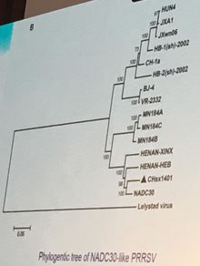 NADC-30毒株通过从北美引种传入中国,类NADC-30从美国NADC-30进化而来,属于1系,从类NADC-30的进化树分析显示,类NADC-30毒株在nsp2上存在131个不连续的氨基酸缺失,该毒株从2014年开始流行。类NADC-30毒株的进化树见下图: