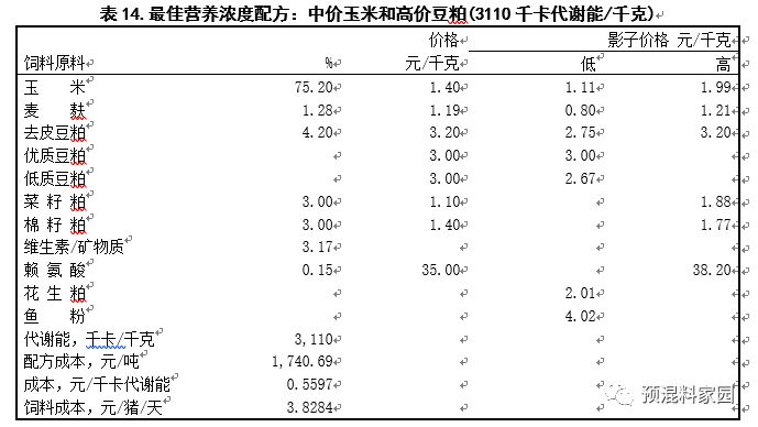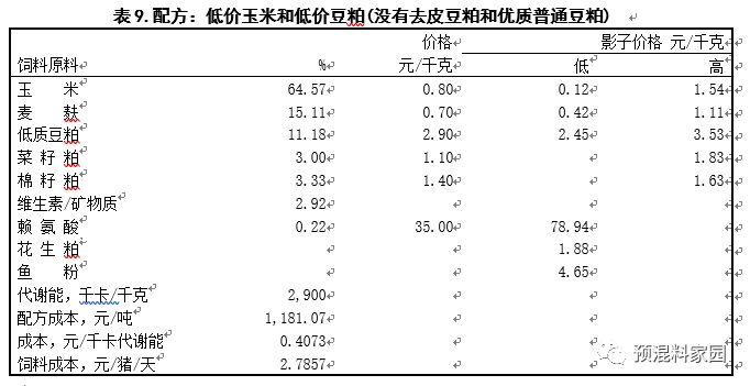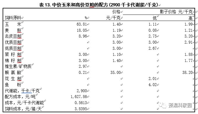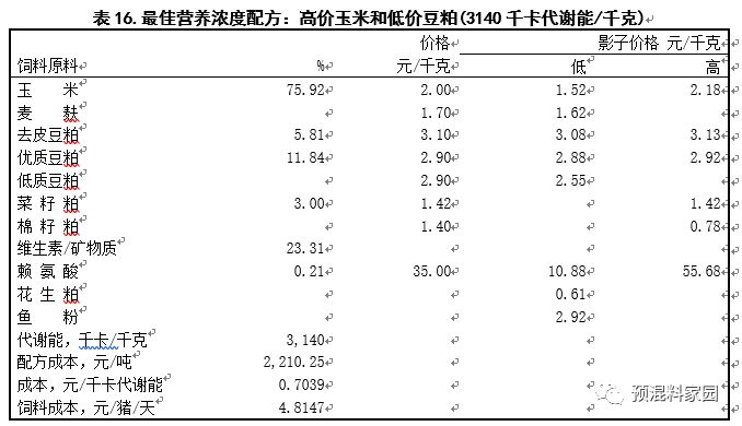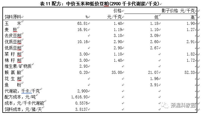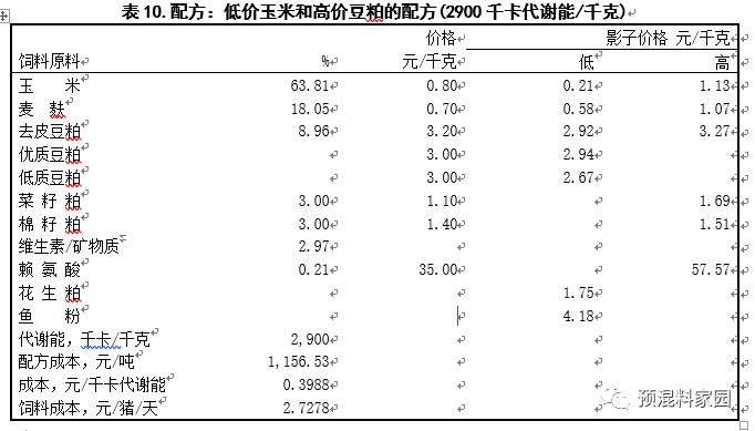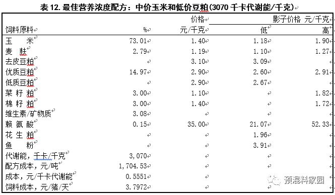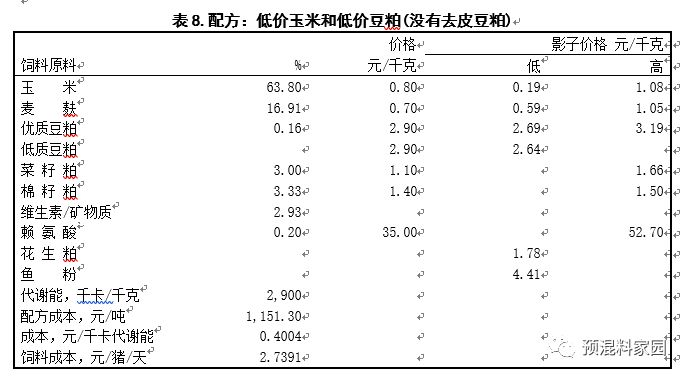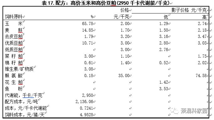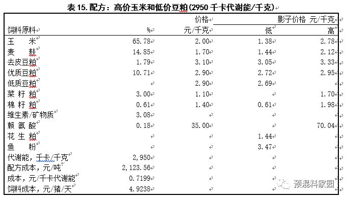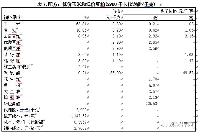 本例中其他饲料间的价格关系与低价豆粕配方的情况类似。