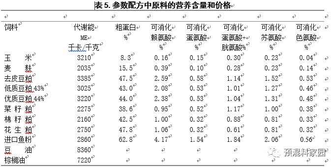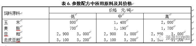 都有两个普通豆粕价,即低质豆粕和优质豆粕(44%)。去皮豆粕比(低质或优质)普通豆粕贵200元/吨。这些价格列于表6中。菜籽粕(1.10元),棉籽粕(1.40元),花生粕(2.00元),鱼粉(5.50元),赖氨酸(35.00元),植物油(棕榈油6.80元,豆油7.00元),预混料和常量元素的价格不变。