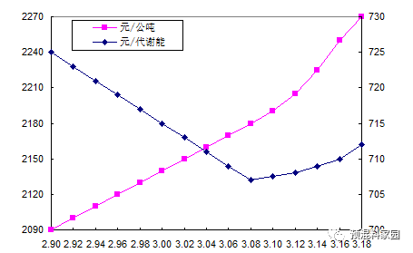 从2900kcal ME/kg(千卡代谢能/千克)到3200kcal ME/kg每隔10kcal ME/kg增量算出一个最低成本配方形成一个系列。随着营养浓度的增加日粮的成本也增加,但每单位代谢能的成本和每天的饲养成本却下降了,这种下降趋势一直保持到最佳营养浓度,在本例中是3110kcal ME/kg。如果营养浓度超过此值,动物的饲养成本就开始上升。