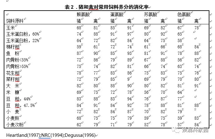某些常用饲料氨基酸消化率的估计值列于表2。合成氨基酸的消化率通常被认为是很高的。如L-型的所有合成氨基酸的消化率都被认为是100%。但D-型氨基酸消化率的变异较大。一般认为DL-蛋氨酸,DL-羟基蛋氨酸的消化率为100%,而D-赖氨酸和D-苏氨酸不能被消化,D-色氨酸的消化率仅为60%,DL-色氨酸的消化率为80%。商品赖氨酸一般都做成盐酸赖氨酸(L-lysine·HCl)形式以提高其稳定性。应注意盐酸赖氨酸消化率虽然达100%,但只含78.5%的赖氨酸。