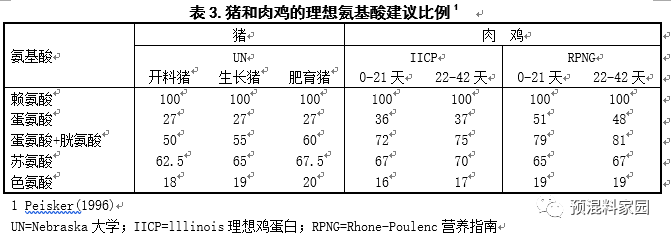 有多种猪和禽的理想氨基酸比例已被制定出来。通常选用赖氨酸为参照,其他氨基酸的需要量以与赖氨酸的比例表示。表3给出了理想氨基酸比例。