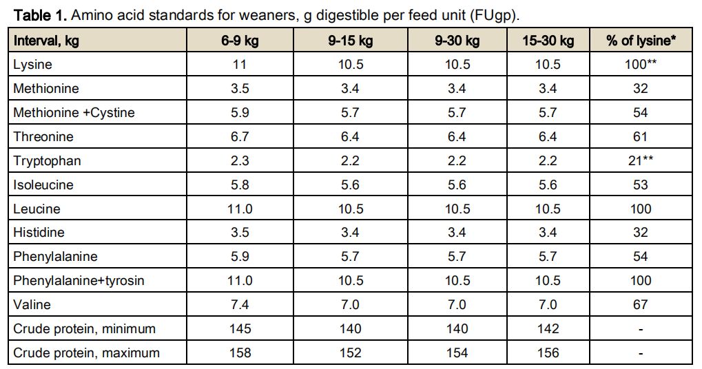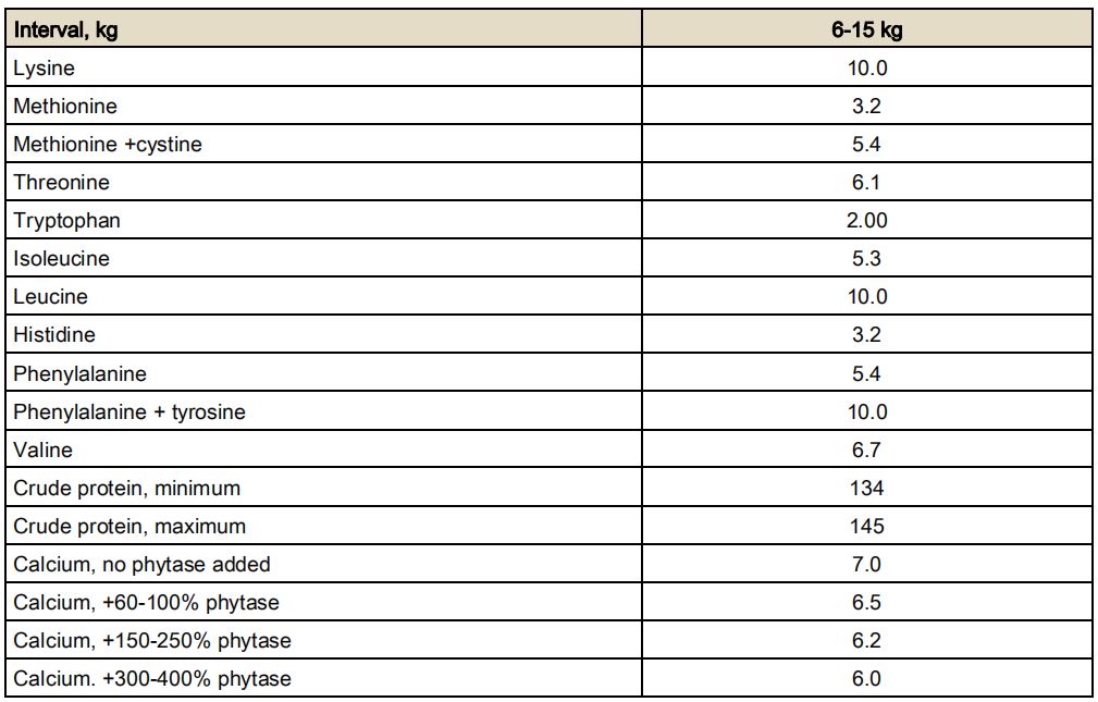 如果赖氨酸水平/体重范围不同于上表,必须确保理想蛋白质的氨基酸组成得到满足 氨基酸标准呈现出这种水平:在正常的氨基酸价格条件下,确保猪群的正常、健康,获得最大毛利率。研究表明,将赖氨酸标准提高7-10%可获得最大生产力【对应于11.8(6-9kg)和11.6(9-30kg)g标准的可消化赖氨酸,每个饲料单位包括上述所有必需氨基酸】。预计这将提高FCR和日增重1-2%。研究还表明,当色氨酸标准从当前约为赖氨酸标准的21%-22%增加到对应的超过表中规定的约0.21克可消化的色氨酸水平时,可获得最大生产力。 表2