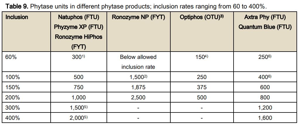 2016 | 饲料中100%包含(标准包含)的Optiphos植酸酶的估计为250 OTU。 |