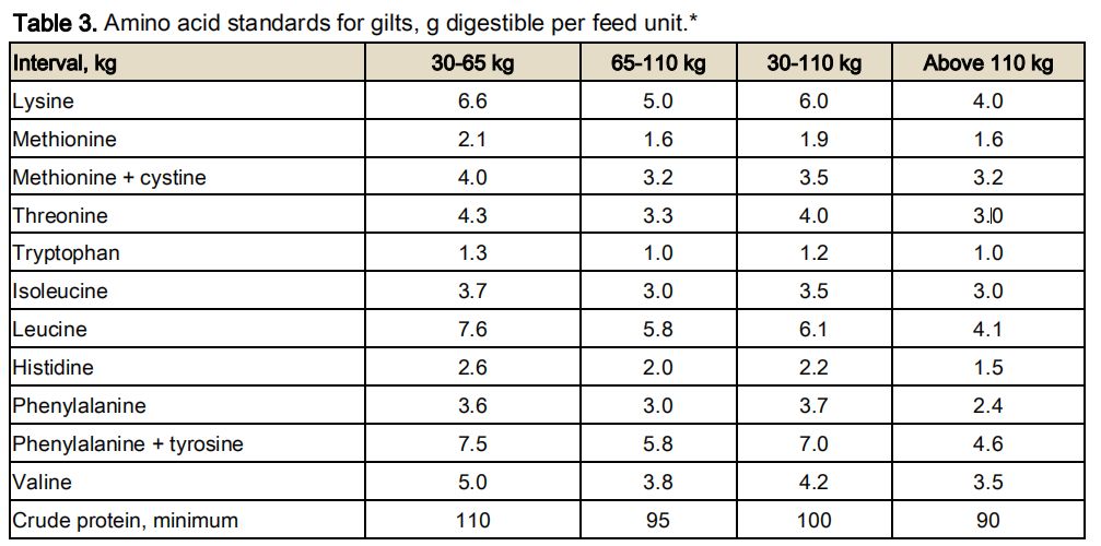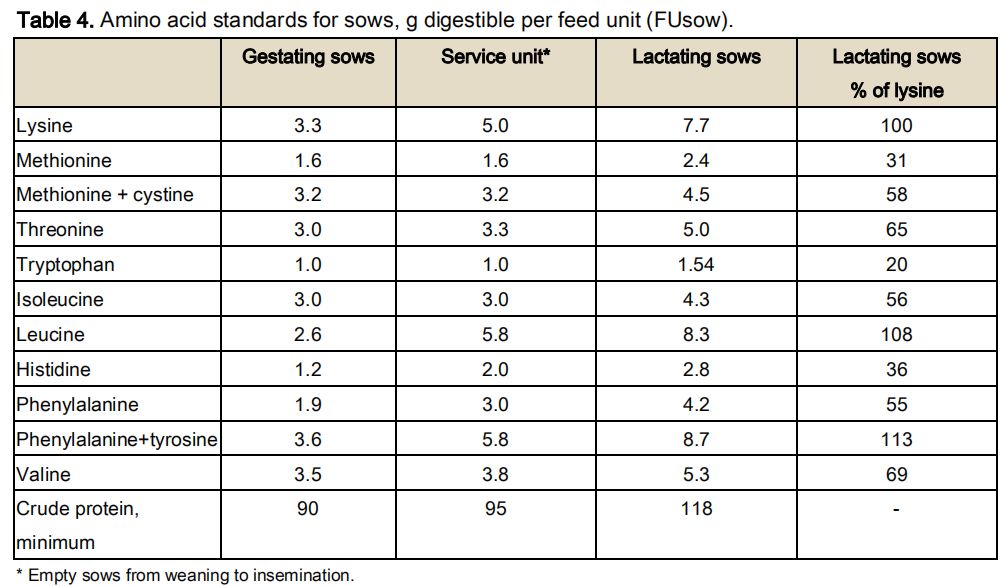 氨基酸标准见表1-4,注意边界值不包括在内。断奶仔猪、保育猪和肥猪的标准是建立在自由采食或是接近自由采食的条件下的。在泌乳高峰期(12-28天)饲喂7FUsow单位(最低饲喂量)时,哺乳母猪与高产母猪标准相一致。后备母猪的标准是建立在限饲基础上的,其目的是在其约8月龄、体重135-150kg的时,后备母猪在第二次发情时能够正常受精。按照怀孕母猪的饲喂标准来饲喂公猪,能满足公猪生产精子所需氨基酸的需求。 这些标准的建立是基于经济上最优化的考量,如果基于生产力最高设定标准,增加的饲料成本会超过生产率提高带来的效益。后备母猪的标准是基于达到每日最大增重(约725g)的标准。 表1,2,3和4显示了猪饲料中最低的粗蛋白质水平。最低水平可防止饲料配方的不准确性。此外,表1还提供了断奶仔猪饲料中最高可消化蛋白的水平的限制,以确保仔猪有效利用蛋白质,因为高蛋白质可能增加腹泻暴发的风险。 表1