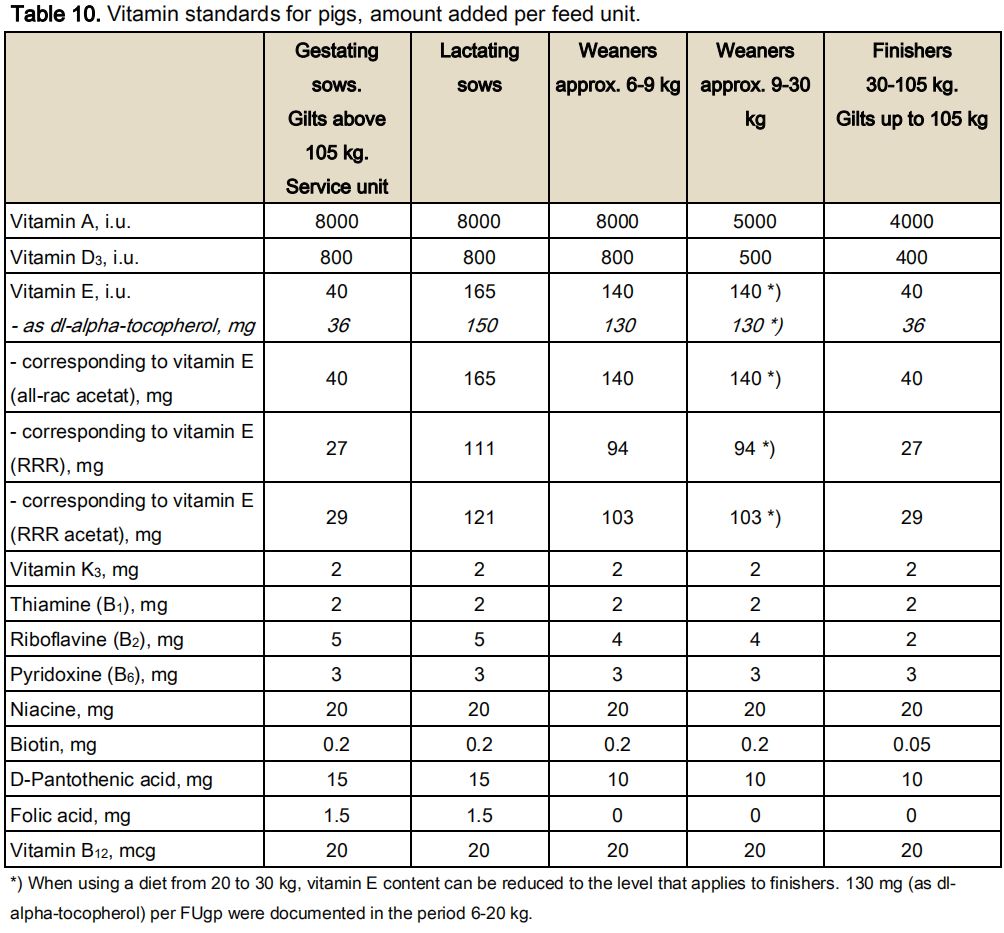 1):Ronozyme HiPhos允许使用的最小含量为500 FYT。 2):只需要1250 FYT即可获得相应的100%效果,但允许的最低限度是每千克饲料1,500 FYT 3):根据不同的分析方法(OTU),Optiphos在欧盟获得批准。在生产实践当中,Optiphos可以通过标准方法(FTU / FYT)进行验证,但最低需要2倍于OTU宣称的量,文献综述表明OTU和FTU之间的换算系数约为2.5,但这将在稍后在欧盟的多个实验室测试中确定。 4):Optiphos在母猪和肥猪的饲料中至少含有:125OTU。断奶仔猪饲料中的最小值:250 OTU(100%)。 5):Phyzyme在断奶仔猪和肥猪的饲料中最高不超过1,000FTU,并且在母猪的饲料中最多只允许500FTU。 6):Axtra Phy最小应含有:250 FTU。Quantum Blue在母猪和肥猪的饲料中至少应含有: 250 FTU。断奶仔猪饲料中的最小值应为:500FTU。 除了最低需要量,维生素的标准是在确保最高生产性能和繁殖性能前提下的安全使用量。在一些维生素的标准上也考虑到最佳健康程度,并且这些是经过科学论证的。 与矿物质标准相反,维生素标准是以添加的量确定的,而不考虑基础日粮中的维生素含量(表10),这是因为饲料中天然维生素的含量差异很大,一般利用率很低,不建议超标添加维生素。 表10 猪的维生素标准,kg/FUgp.