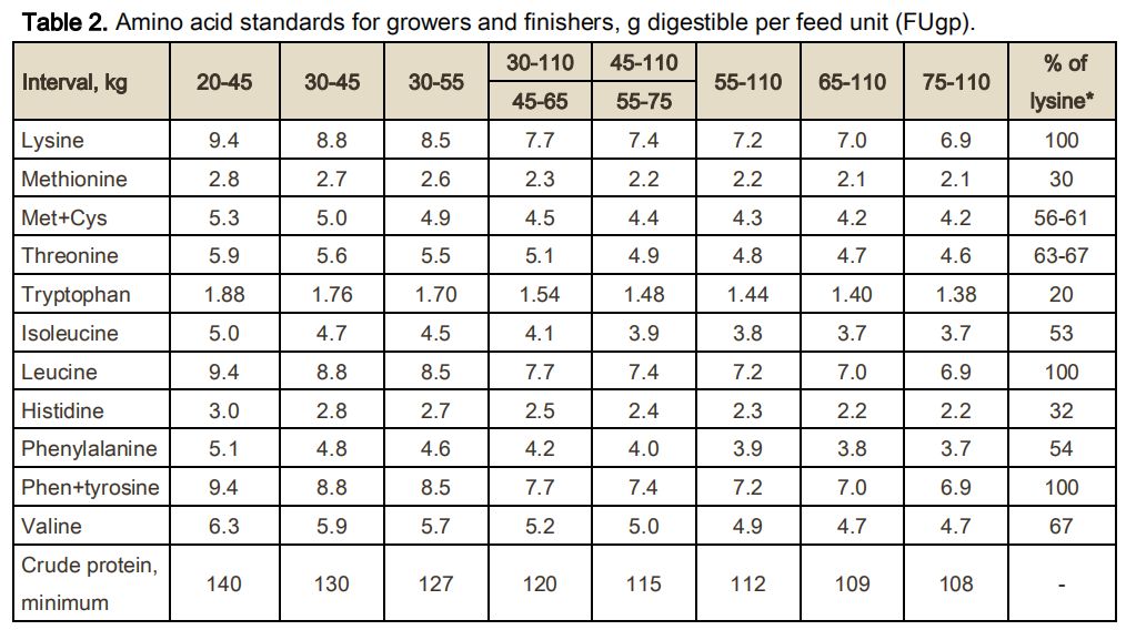 2016 | 体重范围在30-45kg和30-55kg的保育猪的赖氨酸标准提高到了每饲料单位8.8和8.5g。除了异亮氨酸,亮氨酸和组氨酸以外,根据当前氨基酸总则修订了保育猪的其余氨基酸。对所有体重范围的保育猪和肥猪,它们的三种氨基酸降低到与断奶仔猪赖氨酸标准的相同的百分比,即,53% , 100%和32%。肥猪每公斤体重吸收2.8个饲料单位,它的FCR就能提高0.1,与此同时,在所有体重范围内的肥猪的氨基酸和蛋白质标准将提高2.5%。 |