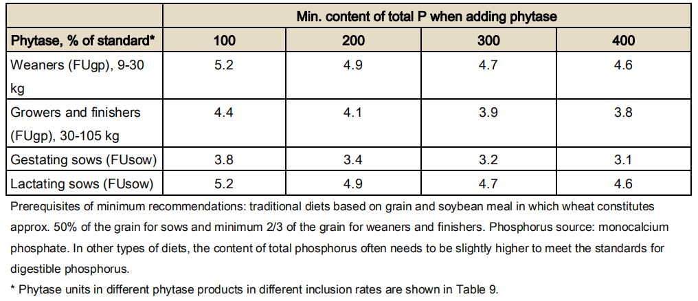 1)根据丹麦饲料法相关规定,每千克全价日粮中不得含有超过0.5mg的硒。根据日粮组成,这意味着它允许每个饲料单位添加0.2-0.35mg硒。 2)建议每个饲料单位添加70mg锌,以符合每个饲料单位100mg的标准,并且避免超过每公斤120mg的最大限量。如果确定饲料中含有最低限量200%的植酸酶,那么添加的锌可能要降低到每个饲料单位40mg。 由于不可能去分析饲料中可消化磷的含量,因此必须根据磷的总含量进行评估。表8列出了含植酸酶日粮中最低含量的总磷的指导原则。 表8