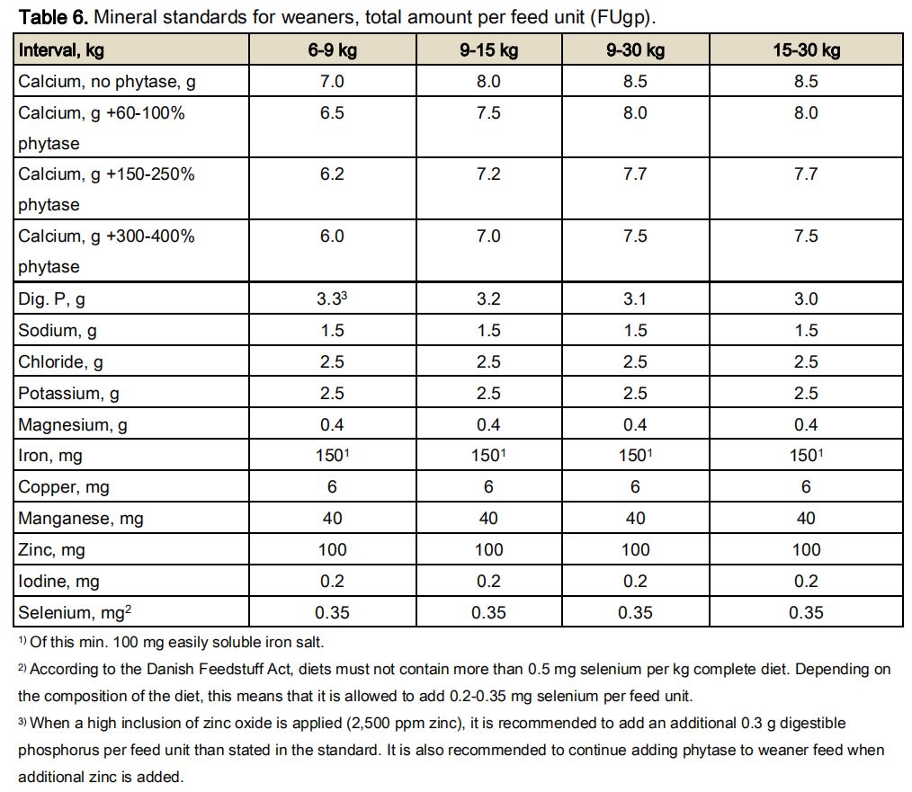 1)铁的最小值。100mg易溶铁盐。 2)根据丹麦饲料法相关规定,每千克全价日粮中不得含有超过0.5mg的硒。根据日粮组成,这意味着它允许每个饲料单位添加0.2-0.35mg硒。 3)当应用高含量的氧化锌时(2500ppm的锌),建议每个饲料单位比原标准额外添加0.3克可消化磷,当添加额外的锌时,同时建议在断奶仔猪饲料中添加植酸酶。 表7