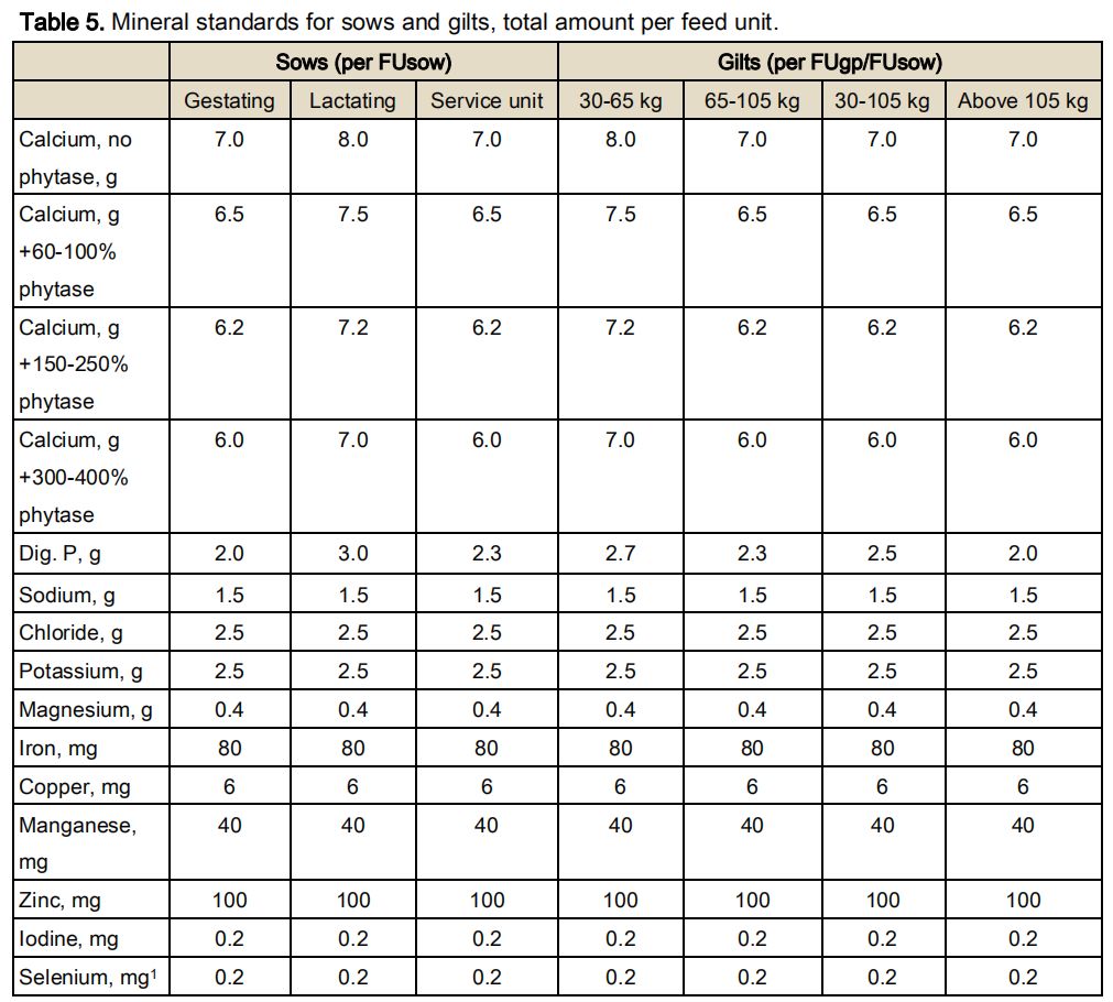 *从断奶到授精的空怀母猪 矿物质标准以猪的需求和安全边界表示,一般不建议猪生产者添加超过标准的矿物质,这特别适用于钙,因为钙与某些微量矿物质相互作用,因此高含量的钙可抑制这些微量矿物质的吸收。 可消化磷标准是最低标准,因此不包括安全边界。 表5,6和7中的矿物标准以饲料中的总量表示。 公猪饲料参照育肥猪的矿物质标准,直到100kg;100kg 以上公猪依照妊娠母猪的标准。 表5