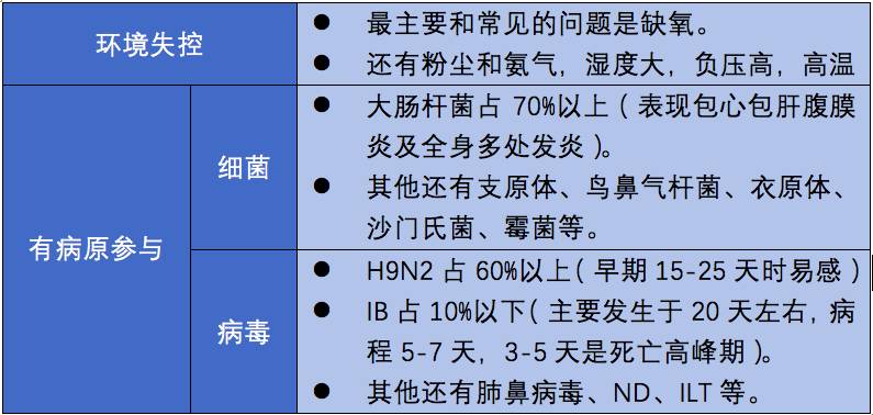 中国农业大学赵继勋教授 腺病毒感染 1 流行情况 腺病毒感染在我国鸡群中是早就存在的,它造成的危害一般不明显,2012年之前表现为包涵体肝炎。 2012年5月始,一种以肝炎-心包积水综合症为表现的新型腺病毒感染出现,至2014年己形成大面积流行,2015-2016年已传播至全国。云南也未幸免。 2 血清型 1、日前,中国鸡的腺病毒感染有两种致病表现,也可称两种疾病,即包涵体肝炎和肝炎-心包积水综合症。 2、依据一群禽腺病毒Hexon基因易变区序列,把不同毒株区分成5个基因:A、B、C、D、E。 按血清学反应(中和试验)分为12个血清型。造成包涵体肝炎表现的病原主要是基因D和E分支的第2、3、6、7、8a、8b、9、11血清型腺病毒。在中国E分支上的8b稍占优势造成肝炎-心包积水综合症表现的病原只有C基因上的4血清型腺病毒。 肝上有白色点状坏死 大量心包积液 3 防控 (1)可选用疫苗,多用新流腺三联苗。 (2)一旦发病也可及时注射含有C基因第4血清亚型腺病毒抗体的卵黄抗体。 (3)病毒在肝脏的包涵体中不能被抗体消灭,容易复发,打抗体时可以稍微过量一些,防止复发。 H9N2亚型 1、病毒变异 H9N2禽流感病毐在产蛋鸡群中大的流行很少发生,但自2013年春发现病毒有轻微变异的动向。 在产蛋鸡群中病毒分离率有增多趋势,江苏、安徽、山东胶东一带有一定的地方性流行报导,分离毒致病性有增强趋势, 新毒株在SPF鸡上表现更明显气管出血和分泌物增多,肝、胰、肠、法氏囊带毒的变化及基因分类位置和2013毒株也有所不同。 2015年发现分离毒和现有疫苗在抗原和免疫保上有明显差异,在全国很多地区已成主要流行株。 疫苗更替已成必然。 2、传播特性 1、H9N2由空气经呼吸道传播,传播能力极强,单纯生物安全措施很难遏制传播。 2、地区间流行程度有差异,季节性不太明显。饲养密度大、养禽业集中地区容易形成地方性流行。 3、由于仅有灭活苖,商品肉鸡的免疫防控难以消除免疫空档期(15-25d)的存在。杜绝H9N2禽流感在商品肉鸡中的感染是很困难的。 4、蛋鸡感染主要是产蛋下降,在育雏、育成阶段感染可能出现一过性呼吸道问题,通常不会造成太大影响。 3、诊断 (1)产蛋鸡 临床表现:产蛋下降通常不超20%,很少出现死亡,出现轻微呼吸道症状;气管有少量粘性分泌物,是初步诊断的指标。 剖检可见:卵泡极度充血,子宫内有分泌物。 实验室诊断:感染后10-14天,HI抗体检测达到≥214 ,可以确诊。 试剂的纯净性很重要:如果临床未见异常,HI检查结果≥ 213 ,多是试剂不纯造成的。 (2)商品肉鸡 在群体中出现HI抗体≥26者有诊断价值,大部分在25d后才能检出低抗体水平,感染鸡群HI抗体可达26-9。 (3)其他方法 PCR方法监测阳性者有重要参考价值。应注意同时设置阴阳性对照。 病毒分离,可以确诊。 4、防控 免疫防控:推荐免疫程序 5、支气管栓塞的防控 支气管栓塞是一种病理表现,是一个症候群,不是一种病或病名。 当前对商品肉鸡(尤其是白羽肉鸡)来说,支气管栓塞成为饲养上的主要难题。绝大多数将其致病原因单纯或主要归之于H9N2感染,认识上是错误的。如果只针对H9N2进行防控是不会有好结果的。 出现支气管拴塞首先判断是有病原参与还是环境失控。 防止支气管栓塞要点: (1)别跟H9玩命; (2)一定不能得大肠杆菌; (3)鸡群密度一大,28天以后一定要防止通风不良。 H9N2亚型 1、现状 从2013年秋到当前,我国H5亚型高致病性禽流感有多个不同流行毒株同时存在。按基因型划分:分布在2.3.2、2.3.4、7.2三个分支上。 感染鸡的有2.3.2分支的H5N1、2.3.4分支的H5N1、H5N6、H5N8、7.2分支上的H5N1(两种类型)、H5N2(两种类型)。 感染水禽的有2.3.4分支的H5-N2、H5N6、H5N8、或许还有2.3.2分支的H5N1。 当前我国鸡和水禽的感染都呈散发,夏季发生减少,进入秋冬增加。 当前需要防控的最重要的禽流感病毒属于2.3.4分支,是2016年的6月份的水禽源H5N6,应该用2016年的6月份以后分离到的水禽源H5N6的疫苗。 2、监测和诊断应注意问题 疫苗内含物和监测用抗原不相符合。疫苗可能含有变异株但监测用抗原是国家标准株。监测结果可能和实际不符。 用标准抗原检测到的抗体不能表示鸡群具有真正的抵抗力。 检测到H5 PCR阳性时,一定要结合生产实际,观察临床表现,结合剖检变化进行综合判断。 病毒分离和鉴定是最终诊断。 3、防控 (1)疫苗防控: 不要盲目多打,关键是要打好,把苗选对。 要用新2.3.2分支新变异株、2.3.4分支新变异株( 2016年的6月份以后分离到的水禽源H5N6的疫苗)。 免疫程序:10d左右第一次,30d左右第二次;开产前第三次;高峰期后第四次;换羽鸡开产前,加免一次。 (2)日常防控 根据外界流行情况适时加强隔离、消毒。特别警惕周围水域的野生水禽,防止野生水禽→鸟→家鼠→饲养舍的传播链条的形成。