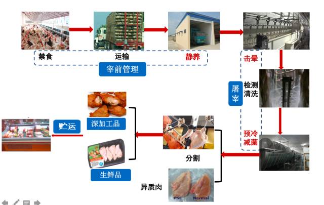 徐幸莲教授从产业概况、鸡肉加工技术进展、提质增效新方向三个方面分享了当下前端的鸡肉加工技术研发与应用进展。 一、鸡肉加工质量安全关键控制点 1、宰前静养品质控制技术: 淋水静养 运输后淋浴10min,水温23-25℃,流速为75-80 m³/h ,静养20min(28-30℃)。 新型静养技术:雾化喷淋-通风静养 采用自墙壁向中间喷淋雾化(雾滴直径小于0.05mm);降温方式与由下而上的抽吸式顶端通风方式结合的技术方案,形成立体式雾化湍流,能够快速有效地对运禽车上的禽类进行降温,保证了宰后禽肉品质。 2、电击晕技术 3、胴体减菌技术 传统:次氯酸钠、乳酸、二氧化氯 新型:酸性电解水、微酸性电解水 有效降低胴体初始菌落总数 (菌落总数下减降0.6-0.8 log) 有效降低胴体初始大肠菌群数量 (大肠菌群下降0.6-1.0 log) 有效延长货架期 4、乳化型产品营养提升技术 脂肪是鸡肉早餐肠风味形成的重要前体物质,但在这类乳化型产品中背瞟添加量高达30%以上。 针对主要依赖于动物脂肪的传统乳化工艺,研发出紧密压缩高浓度(>40%)植物油乳化液。 紧密压缩高浓度植物油乳化液,结合斩拌时间-速度-温度的控制,实现了乳化肠产品的脂肪酸均衡化。 5、包装贮藏技术 二、提质增效新方向 延长产业链,大力发展精深加工是肉鸡产业体质增效的必由之路! 1、大力提升加工装备的自动化水平; (1)解决招工问题 (2)降低生产成本 (3)减轻劳动强度 (4)稳定产品品质 2、符合现代消费理念的产品设计:美味/方便/营养/健康/个性化/多样化; 3、更加重视食品安全和动物福利; 4、产品销售模式的多元化创新; 5、对接国家战略,开拓海外市场。
