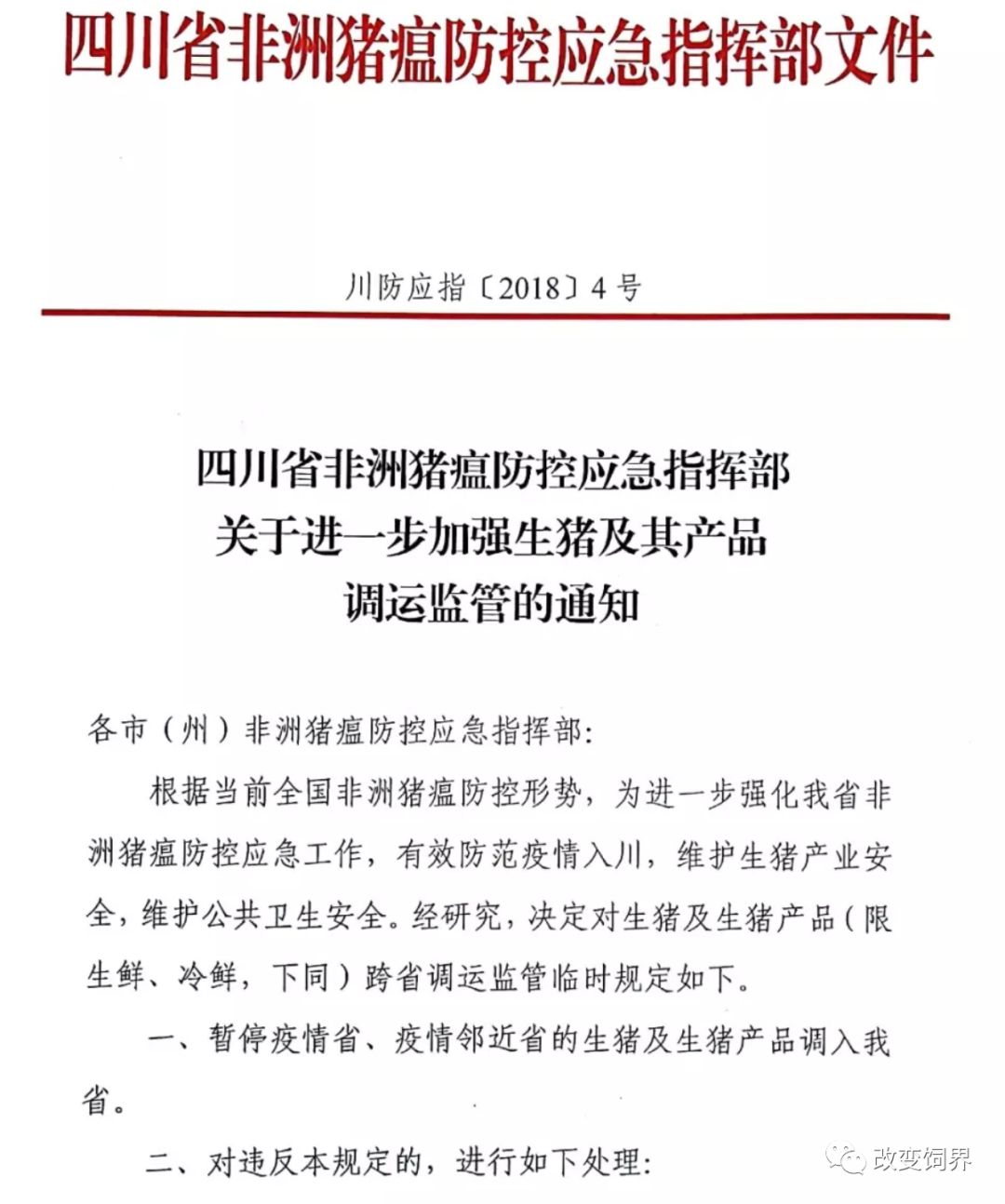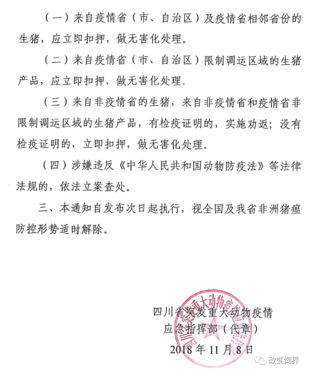 从即日起,我省全面暂停生猪和生猪制品入川,严控物流通道,全力阻止疫源入川;把排查监测作为疫情防控的重中之重,动员各方力量,扫除管控死角;严格抓好餐厨剩余物全链条监管和猪用饲料监管,做到防微杜渐;完善应急预案,制定应急措施,强化要素保障,积极做好应急处置准备;再次明确,落实政府属地责任、部门监管责任、企业主体责任,形成防控合力;各级要实施动态督查检查,层层传导防控压力,确保措施到位。
