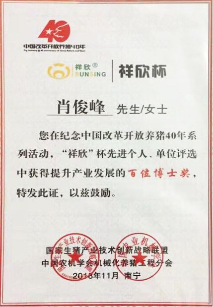 会议同期举办“祥欣杯”纪念中国改革开放养猪40年“一遍天之夜”颁奖典礼,为“中国改革开放40年影响养猪业的100位人物”、“中国改革开放40年养猪双百佳企业”、“中国改革开放40年推动养猪产业提升的百位‘猪博士’”颁发奖牌及证书。