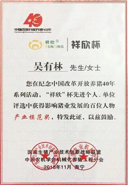 集团获“百佳养猪服务企业奖”、集团董事长吴有林获“产业模范奖”,集团技术中心副总裁肖俊峰入选“猪博士”名单。