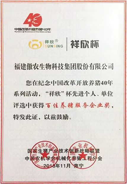 斩获三项荣誉,这是社会各界对傲农的又一次认可,也是行业对傲农实力的又一次见证。未来傲农定将继续做改革开放的继承者、追随者、引领者,让改革开放这股“春风”福泽更多农牧人,并持续发扬诚信、激情、分享、创新的傲农精神,牢守初心,开拓奋进,与业界同行一起把中国“吃肉的饭碗”端得更稳。