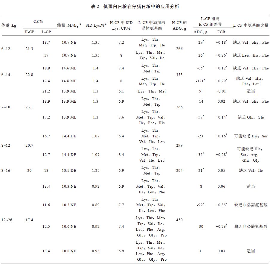 近几年,大多数研究发现,降低仔猪日粮4~6 个百分点的CP 含量对仔猪的生长性能没有影响,同时还能改善仔猪的肠道健康,减少腹泻,改善健康状态。从表1 中研究结果可见,仔猪体重在10 kg 左右的前7 个试验中,仔猪日粮标准回肠可消化赖氨酸(SID Lys) 含量在1.30% 水平以上时, 高蛋白和低蛋白处理的仔猪平均日增重(ADG)都在335 g 以上;而仔猪日粮 SID Lys 含量在1.10 % 水平左右时,仔猪ADG 在129~226 g。将这7 个试验的SID Lys 含量分别与高蛋白组和低蛋白组的ADG 进行相关分析,其相关系数都大于0.93,高蛋白组的CP 含量与ADG 相关系数为-0.72,低蛋白组的CP 含量和ADG 相关系数为0.31。虽然这些数据有限且非同一试验得出,但再次证明蛋白质营养的本质是氨基酸营养,高CP 水平并不能保证好的生长性能。SID Lys 水平和平衡氨基酸营养才是关键。