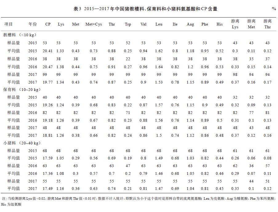 2015—2017 年赢创德固赛(赢创)在全国范围内采集猪全价商品饲料样品,采用湿化学分析方法检测CP、总氨基酸和游离氨基酸含量(表3)。我国教槽料CP 含量由2015、2016 年的20.41%、20.47% 下降到2017 年的19.77%,降低了0.64~0.70 个百分点,降幅明显。同时随着教槽料CP 含量的降低,饲料中晶体Lys、Met 和Thr 的添加量都呈现增加趋势,如游离Lys 含量由2015 年的0.30% 增加到2017 年的0.37%, 游离Met 含量由0.11% 提高到0.16%。另外添加晶体氨基酸的饲料占整个饲料样品数量的比例也在提高,2015 年教槽料的3 种晶体氨基酸的添加比例都为81%,而2017 年98 个调查样品中,有98 个饲料样品添加晶体赖氨酸(100%),94 个饲料样品添加晶体Met 和晶体Thr(95%)。降低CP 含量的同时增加晶体氨基酸添加量,可保持教槽料中总氨基酸含量稳定。教槽料中的这些变化同样出现在保育料和小猪料中。可见低蛋白日粮应用和合成氨基酸添加已普遍被厂家所接受和认可。2017 年我国教槽料的平均CP 为19.77%,保育料CP 为18.81%,小猪料CP 为17.49%,建议猪体重小于10 kg 时的饲料CP 水平为 18%,10~20 kg 的CP 水平为17%,20~40 kg 的CP 水平为 16%。与赢创推荐的CP 水平相比,我国仔猪料CP 水平有1.5~1.8 个百分点的降低空间。