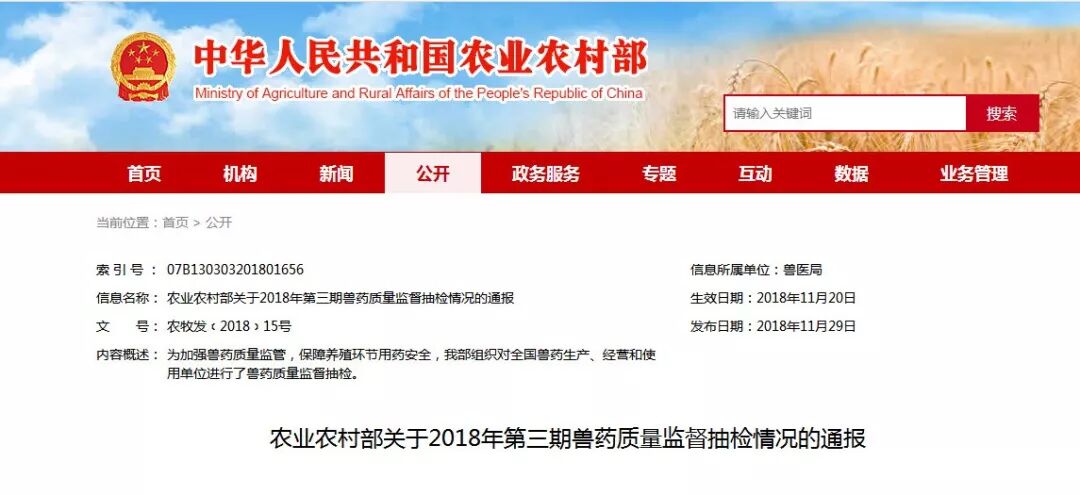 2018年11月29日,农业农村部发布今年第三期兽药质量监督抽检情况通报。其中,兽用生物制品合格率98.9%,兽用化学药品和中兽药合格率97.5%。 农业农村部关于2018年第三期兽药质量监督抽检情况的通报