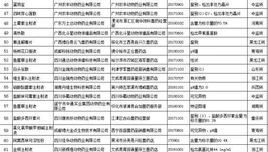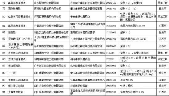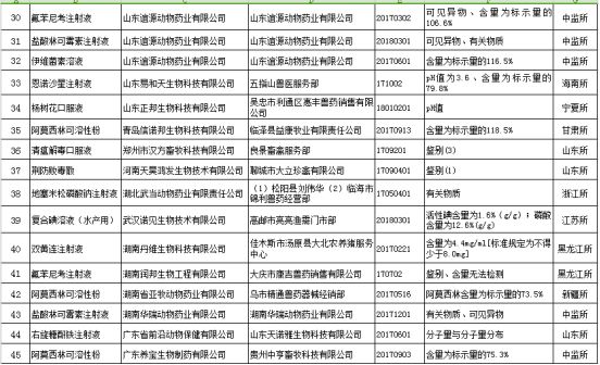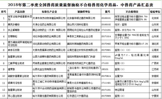 2018年第二季度全国兽药质量监督抽检不合格兽用化学药品、中兽药产品汇总表