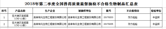 2018年第二季度全国兽药质量监督抽检不合格生物制品汇总表