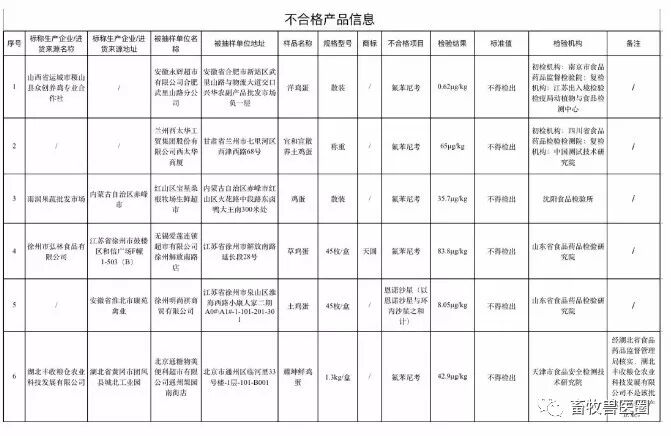 国家市场监管总局通报显示,安徽永辉超市有限公司合肥武里山路分公司销售的1批次散装洋鸡蛋、甘肃省兰州西太华工贸集团股份有限公司西太华商厦销售的宜和宣1批次称重土鸡蛋、内蒙古自治区赤峰市红山区宝星桑根牧场生鲜超市销售的1批次散装鸡蛋、江苏省无锡爱莲连锁超市有限公司徐州解放南路店销售的1批次“天圆”牌草鸡蛋(45枚/盒)、北京通糖物美便利超市有限公司通州梨园南街店销售的1批次耀坤鲜鸡蛋(1.3kg/盒)都被检查出氟苯尼考。