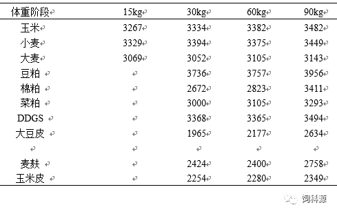 表3不同体重阶段猪常用饲料原料消化能值比较(单位:kcal/kg)