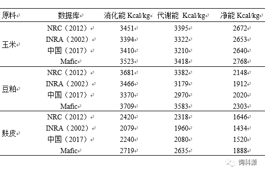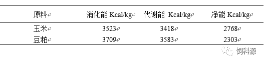 表1玉米豆粕有效能值