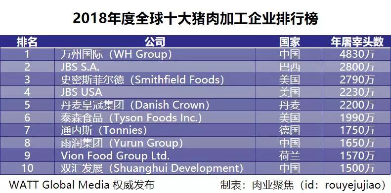 全球农业媒体行业领导者WATT Global Media于日前发布2018年度全球领先猪肉生产和加工企业(The Worlds Leading Pig Producers and Processors)名单。