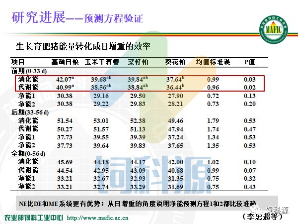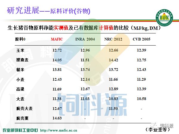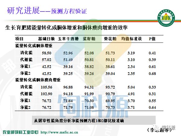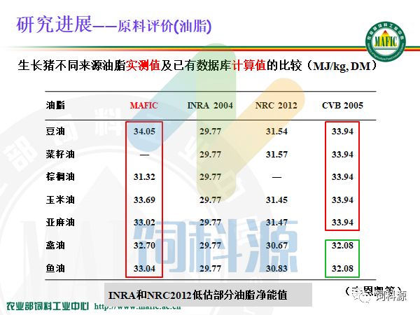 通过数据比较和验证,我们的值和INRA、CVB、NRC的都有所不同。2004年还有美国的12年NRC的,基本上是一个数,是因为他把油脂按照一个计算方式来计算,CVB的都是33.94,大家想一想,不同油脂,饱和的不饱和的,长链的短链的中链的都用一个值是不是不合理。所以我们觉得还是应该用不同的数值,不同的油脂,不同的能值,可能更加合理。我们这都是实测出来的,是不是更好一点。所以这些数值都供给大家来使用。