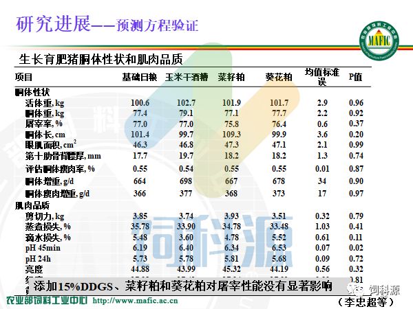 这是什么概念呢?我们用15%的DDGS和菜籽粕、葵花粕替代以,后用净能值做日粮,没有什么显著的影响,这更加精准。就是说除了豆粕以外,用更多的杂粕、更多的非常规蛋白质原料还能够保证相似的生产性能,这是我们所追求的,从我们的验证来看是非常可用的。所以我们净能值的推测方程是非常值得推敲值得使用的。现在豆粕都在涨价,尽管习 zhu xi 和特朗普握手了,可能也需要一定长的时间来解决贸易大战的问题。