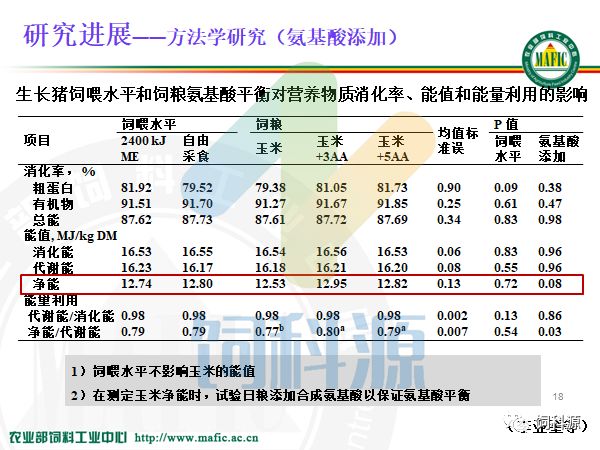 在测定净能的时候,添加合成氨基酸能够保证氨基酸的平衡,对净能影响并不是很大。这里是0.08,我们要求的统一水平是0.05,但是无论如何,玉米加三种氨基酸和五种氨基酸,对能值有一点点的变化。这个工作希望我们在做日粮配方的时候给予考虑,毕竟它对净能有一定的影响力。