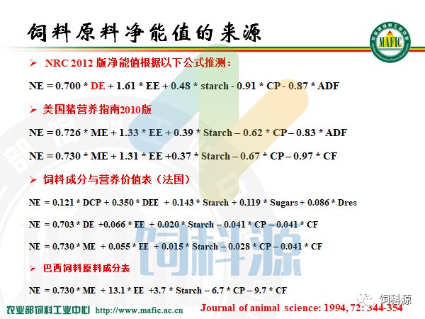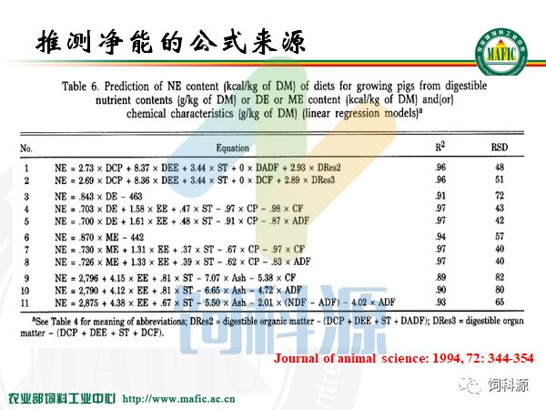这是94年法国人发表的11个净能推测方程。现在所谓的净能体系大部分都在这里面找一个方程一个值来做净能日粮。