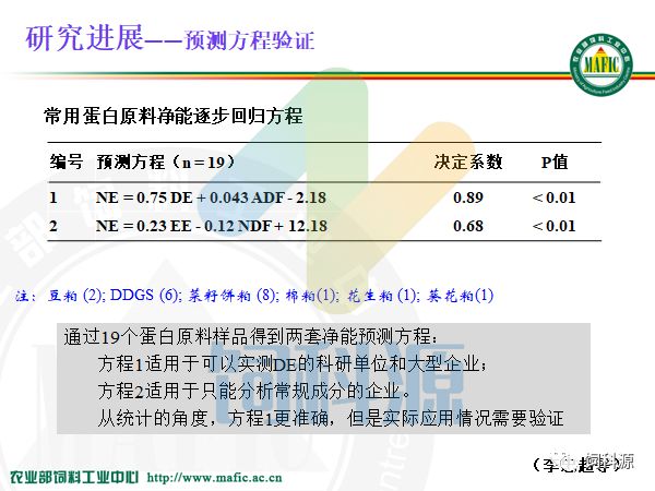 验证我们做了很多,在这里简单给大家说一说。其中一个工作是李忠超做的这么多的验证,不同的发酵豆粕,方程一方程二。