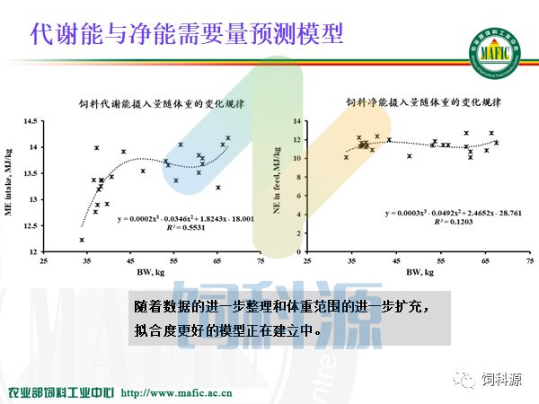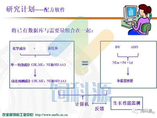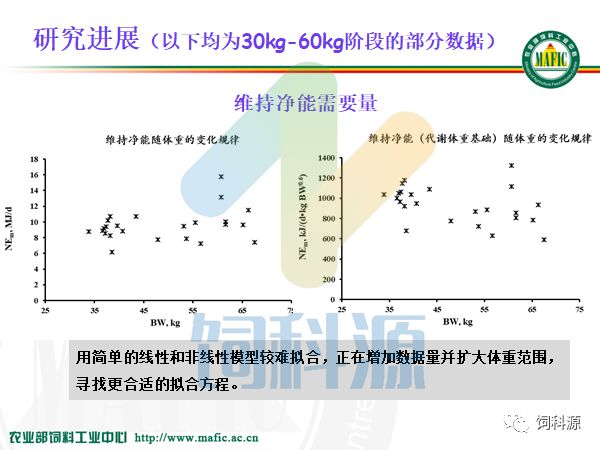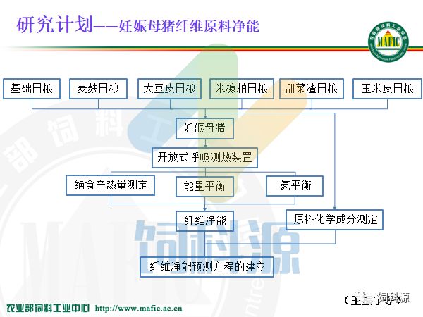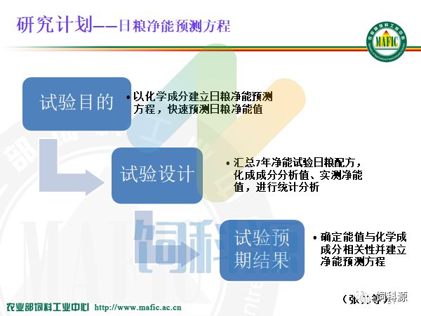 饲料中心做净能,十几年来都是按照这个框架做下来的,我觉得还是很有价值的。而且团队少了不好做,我们这样一个大的团队有20几个人专门做饲料原料的数据库,净能值是一个方面,还有动态的数据库,还有近红外NIR,近红外现在看来非常迎合市场需求,使我们能够做到精准配置,实时测定饲料原料的营养含量,在这里跟大家说一下,如果大家需要NIR的方程的话,我们可以给大家做服务。到这个月底,我们能有14个原料的NIR的有效成分的推测方程。如果在座的各个企业,我看今天朱正鹏也来了,邵彩梅也来了,需要有效成分的推测方程的话,我们可以完全帮助大家来用。因为现在能够做到仪器转移,从我们这个近红外仪转到另一个仪器上,需要一个转移的方法,还需要校正,我们都能够做到。但是我想说的是,今天给大家介绍一个概念,净能研究领域我们应该站到全世界的前沿,特别是我们有九台设备,在全世界有九台设备的也只有我们一家,法国人也只有两台,我都看过,他说我养这两台设备都不容易了,九台的话是养不起的。但是他们的经验教训很多,所以我们跟他一起来合作,一起做这个工作。