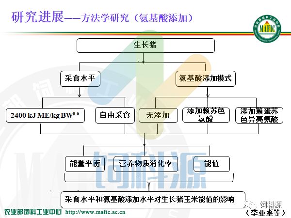 首先大家都知道低蛋白日粮要加合成氨基酸,加氨基酸降低了蛋白的水平,但是氨基酸对净能的贡献没有人做过。所以我们这里做了添加氨基酸以后对能值的影响。这也是跟法国人合作他的建议。因为做了很多的这种数值,这次我们饲料协会提出来低蛋白日粮其实也是种挑战,低蛋白日粮需要加合成氨基酸,现在所认可的是赖氨酸、蛋氨酸、苏氨酸、色氨酸、缬氨酸,那么问题是,我们加合成氨基酸的时候,价格会不会涨,而且我们合成氨基酸的供给量有没有那么多,我们中国除了长春大成能够生产赖氨酸,其他氨基酸我们自己都生产不了,这也会产生另外一种矛盾,所以上次颁布了团体标准以后,有人打电话质疑这个问题,这也是我们值得考虑的事情。今天我们说的是添加氨基酸对净能的影响,是我们这里首先做的工作。