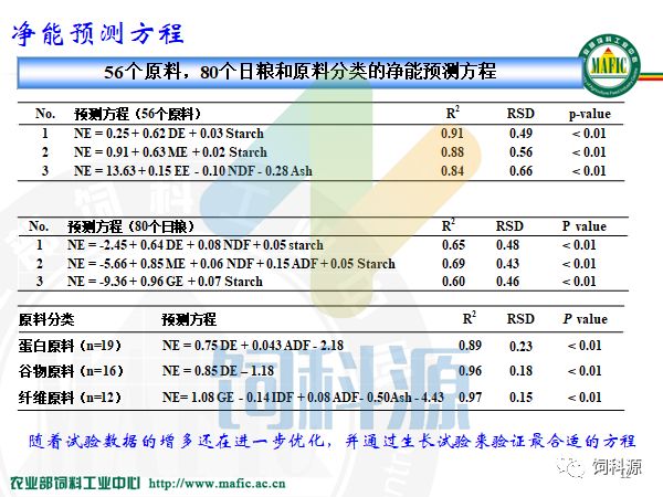 我们中心这些年来一直都在做,我们认为一个方程不应该适用于所有的原料,我们把它分成蛋白原料、谷物原料、纤维原料、脂肪原料。例如蛋白原料做了19个,这个16个,这个12个。随着时间的推移。我们从19变成50,那我们的方程就更加精准,但是这太耗时了,一做就是三个月,所以我们随着时间推移,我们的样本量增加,我们方程的准确率也就更加合理了。所以我们想将来按照原料的种类,蛋白原料用这个方程,谷物用那个方程,这样可能会比用原来的11个方程之一更加准确,因为11个方程是全价日粮的。