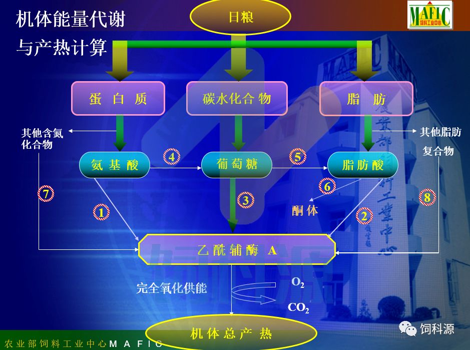 这个图我找了半天,最后找到了。实际上我们能够变成能量的,就这三大营养物质,最后变成乙酰辅酶A,最终产热供能。我想说的是,这三种营养物质,如何能保持平衡,该供能的供能,该提供给氮源的供给氮源,这样利用效率才高。能做到这一点太不容易了。其实,这次大会广告上说的什么新的配方创举,其实都不主要。饲料配方没有多少奥秘,重要的是我们怎么能够尽快的知道每一种原料里面含什么,含多少,多少有效能。1+2=3是不会错的,但是如果1错了,那3肯定就错了。所以我就说,我们现在讲的蛋白质用来供能,供给乙酰辅酶A是最不上算的,而且蛋白质饲料是成本最高的。我希望今天在座的所有技术总监,要理解个道理,我们最终要想精准,就应该把每一种原料的有效成分或者是营养成分都能够推测准确,或者准确程度高一些,才能够做到降低成本。