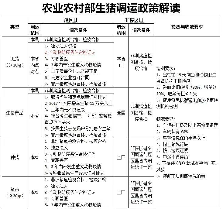 通知中尤为值得注意的是:(1)疫区所在县内的生猪养殖企业符合下列条件的,可在本省范围内与屠宰企业实施出栏肥猪“点对点”调运,具体办法由各省规定。 (2)疫区所在县的种猪、商品仔猪(重量在30公斤及30公斤以下且用于育肥的生猪)经非洲猪瘟检测合格和检疫合格后,可在本省范围内调运。疫区所在县以外的种猪、商品仔猪经非洲猪瘟检测合格和检疫合格后,可调出本省。各地不得阻碍经非洲猪瘟检测合格和检疫合格的种猪、商品仔猪调运。