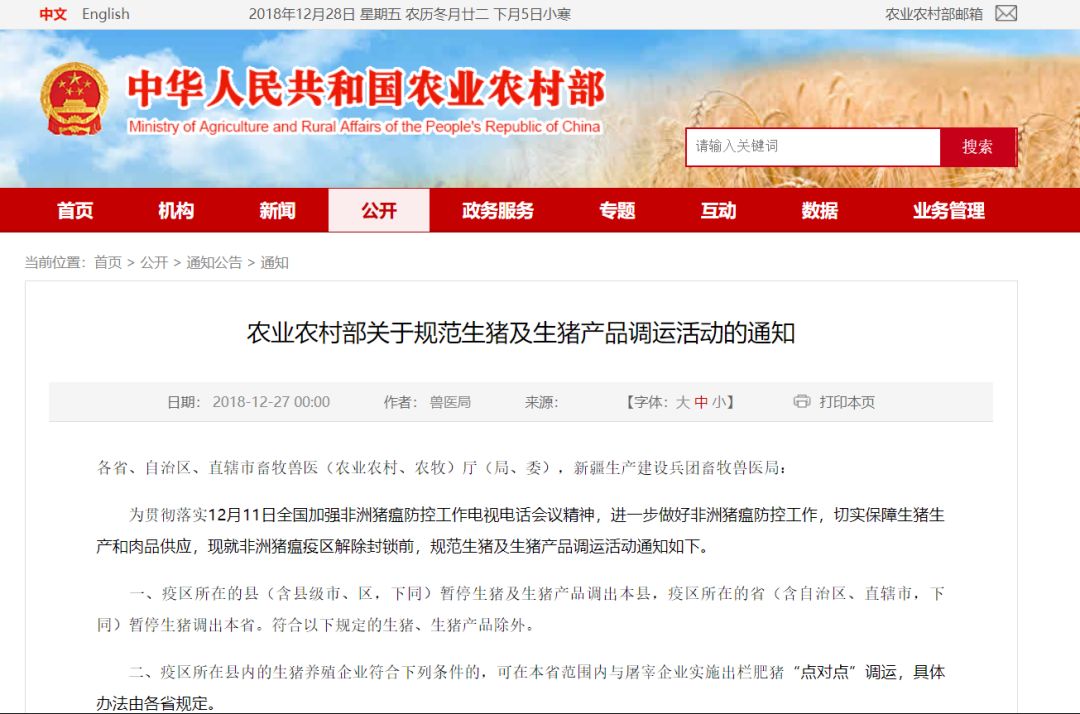 2018年12月27日 00:00,农业农村部发布了“关于规范生猪及生猪产品调运活动”的通知。