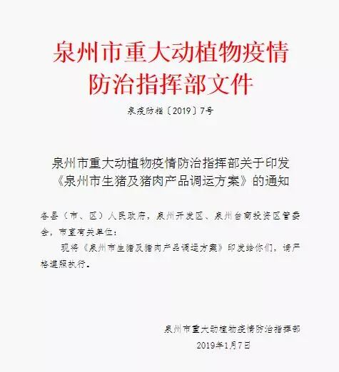 根据《泉州市重大动植物疫情防治指挥部关于进一步加强非洲猪瘟防控工作的紧急通知》(泉疫防指〔2019〕3号)要求,采取“规模场减栏,散养户清栏”的措施,分别在1月15日前减栏、1月20日前清理完毕,需要消化本地部份生猪,同时防范市场价格大起大落。