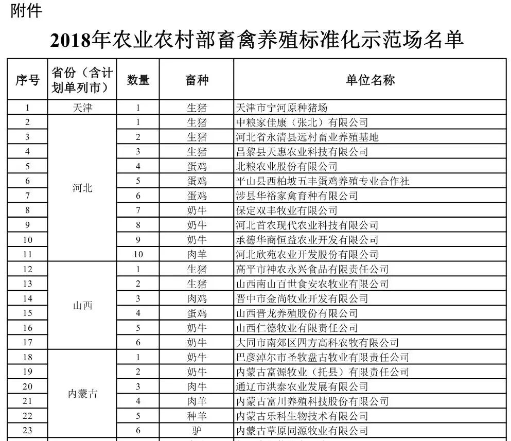 附件:2018年农业农村部畜禽养殖标准化示范场名单