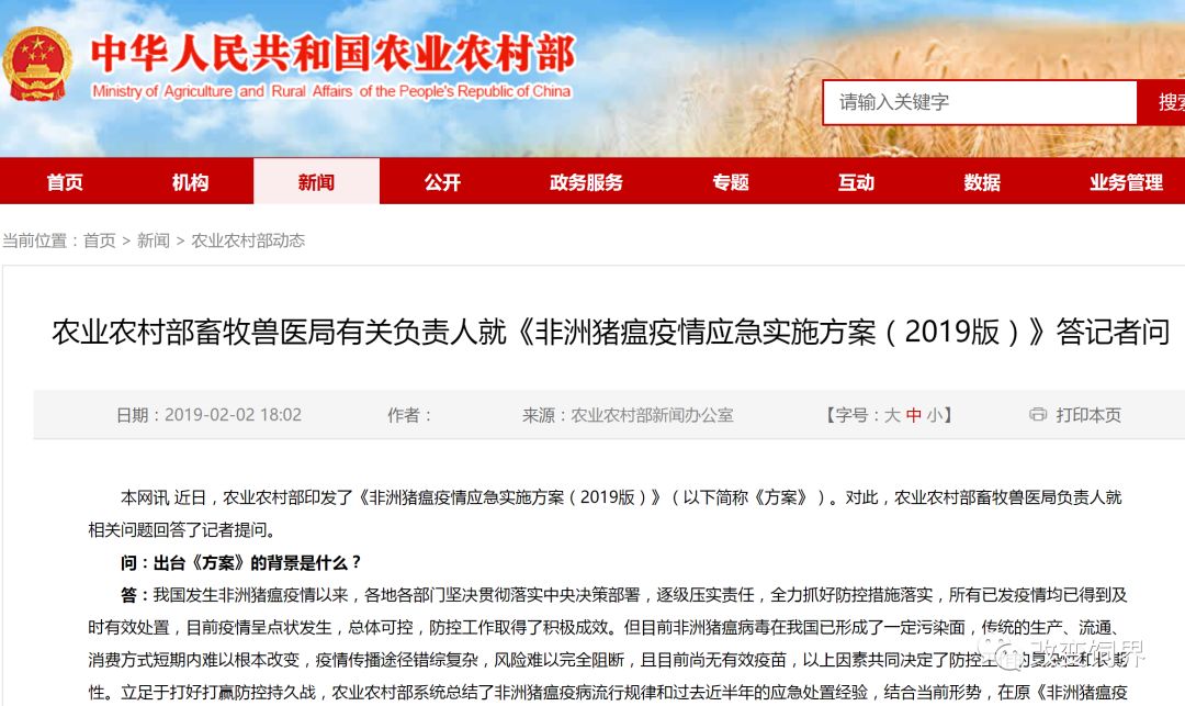 近日,农业农村部印发了《非洲猪瘟疫情应急实施方案(2019版)》(以下简称《方案》)。对此,农业农村部畜牧兽医局负责人就相关问题回答了记者提问。