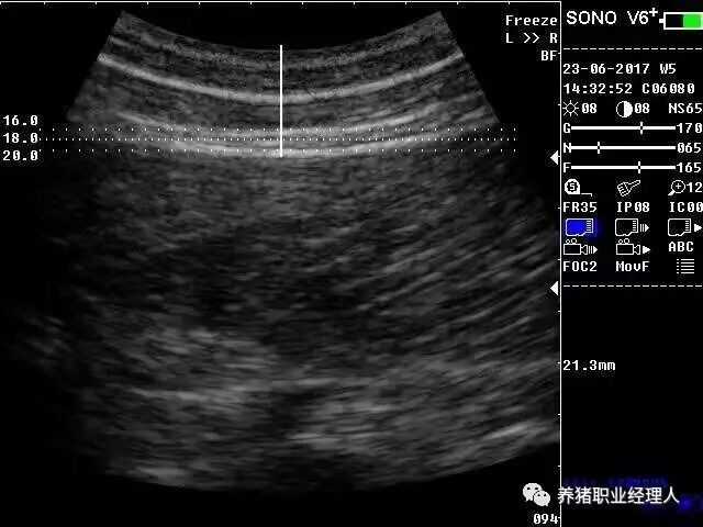 由于胎龄大的母猪会存在坚硬的老化皮肤,需要额外地用力才能将探头和皮肤保持良好接触。可以剃掉测量点上的猪毛,然后用热水润湿皮肤,再上清油使之侵入皮肤,等待一两分钟后再开始测量;而年轻母猪的皮肤较软,可以直接测量。