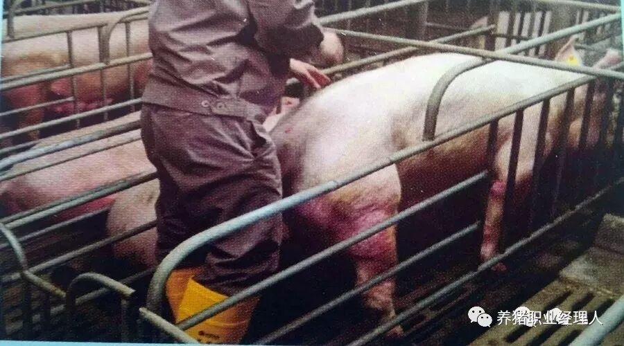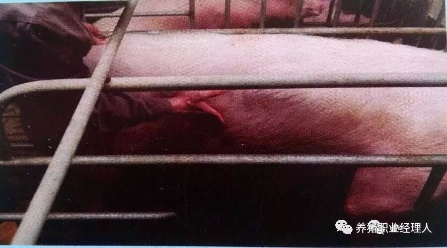 首先用手沿着母猪腹侧从后面前移动找到母猪最后一根肋骨,注意如果母猪偏肥手指需要稍微用力按压皮肤才能更好摸到肋骨。