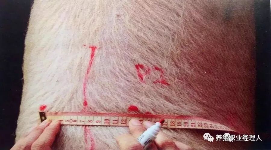 测定背膘部位为P2点位置,P2点位于最后一根肋骨的外切横截面,距离背中线6.5厘米处,背中线两边对称取点都为P2点。确定P2点较便捷的方法是用食指沿着腹部侧面按压并向前移动找到最后一根肋骨,同时用大拇指指向母猪脊椎背中线,取6.5厘米处的位置即为P2点。