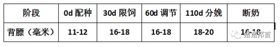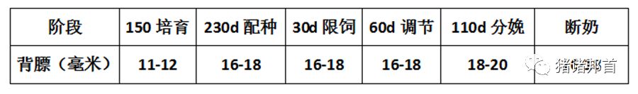 因为品种、饲养管理、饲料营养、地域差异,母猪的背膘厚度标准会有一定区别,母猪各阶段背膘厚度参考见下表。